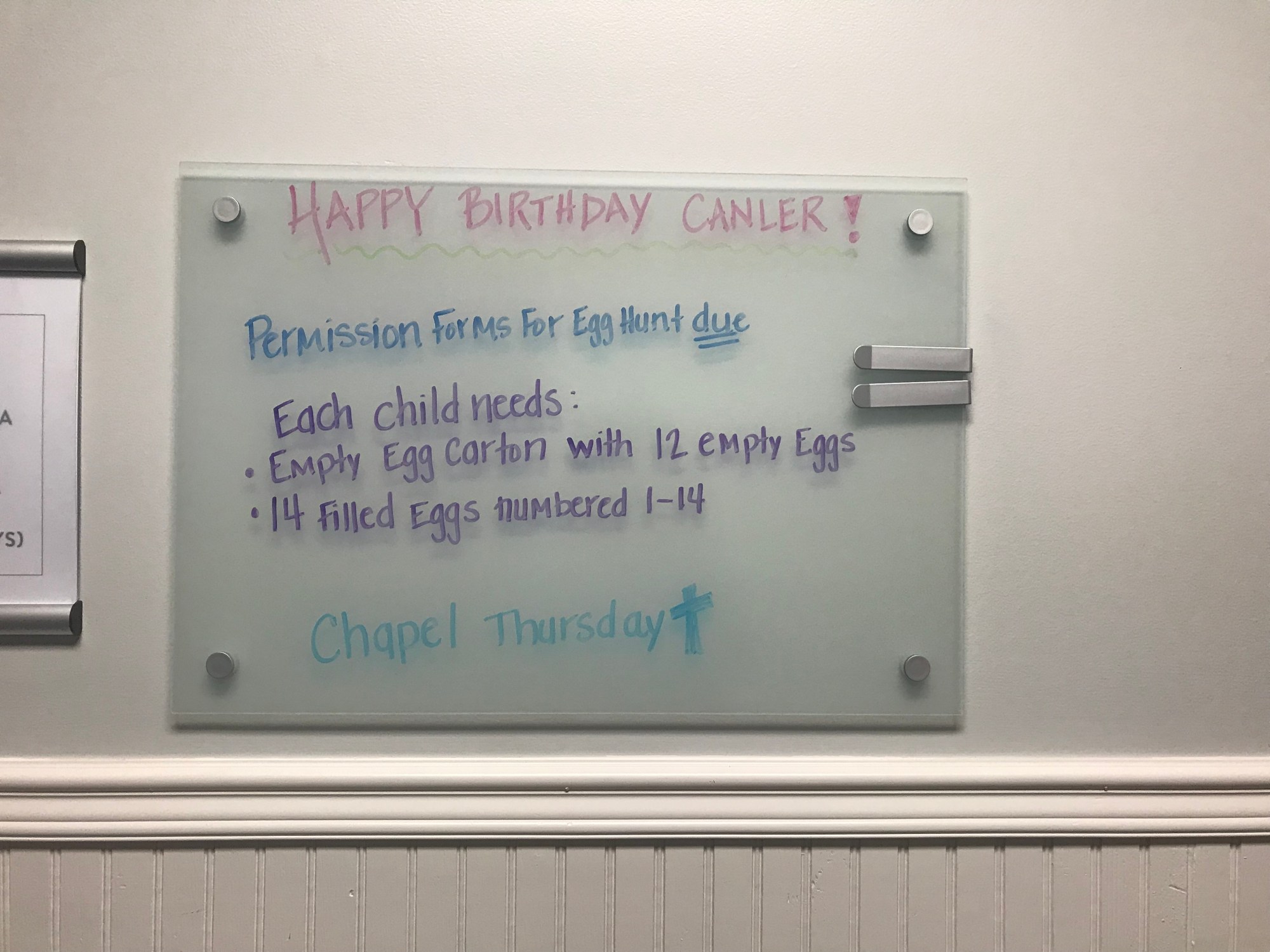 1. Use glass dry erase boards from IKEA in the hallway outside Class Annoucement Boardof your classrooms for announcements.  You can use colored dry erase markers on these boards for a colorful, but clean, simple look.  Share information with parents about upcoming activities or snacks you will be serving including any food allergy alerts.