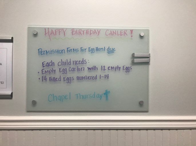 Use glass dry erase boards from IKEA in the hallway outside of your classrooms for announcements. You can use colored dry erase markers on these boards for a colorful, but clean, simple look. Share information with parents about upcoming activities or snacks you will be serving including any food allergy alerts.