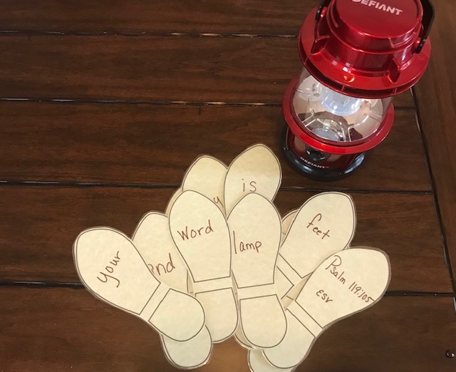 Create a path in a room, hallway, or through more than one area using the shoe prints. Give your child a lantern/flashlight and have them step/hop along the verse path while they recite the verse.